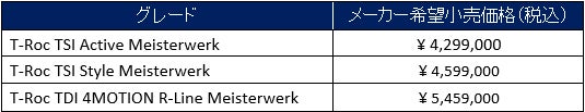 フォルクスワーゲン グループ ジャパン株式会社 (東京都品川区、代表取締役社長:マティアス シェーパース)は、クロスオーバーSUV ”T-Roc”(ティーロック)シリーズの主要グレード”TSI Active”、”TSI Style”および”TDI 4MOTION R-Line”をベースに、装備を充実させながらも魅力的な価格を実現した 特別仕様車”Meisterwerk”(マイスターヴェルク)を設定し、本日より全国のフォルクスワーゲン正規販売店において販売を開始します。