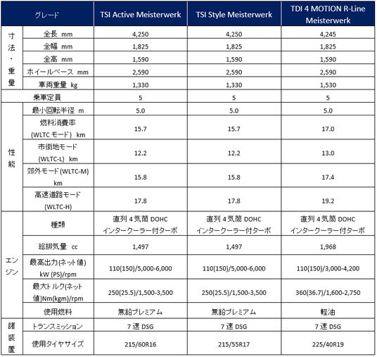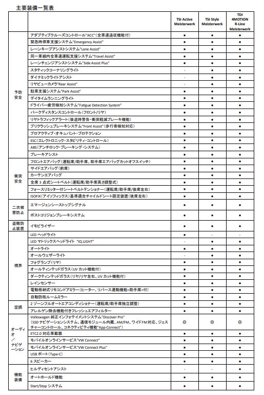 “TDI 4MOTION R-line Meisterwerk”は 従来”R”モデルのみが選択可能だった”ラピスブルーメタリック/ブラックルーフ”の外装色がオプションで選択可能で、さらに19インチアルミホイールが標準装備されます。よりスポーティなエクステリアスタイルを”TDI 4 MOTION”のパワートレインで満喫したいという お客様のご要望に応える待望のモデルです。”TSI Active/ Style Meisterwerk”にはシートヒーター(前席)およびVolkswagen純正インフォテイメントシステム“Discover Pro”が標準装備となり、快適性と利便性の向上が図られています。