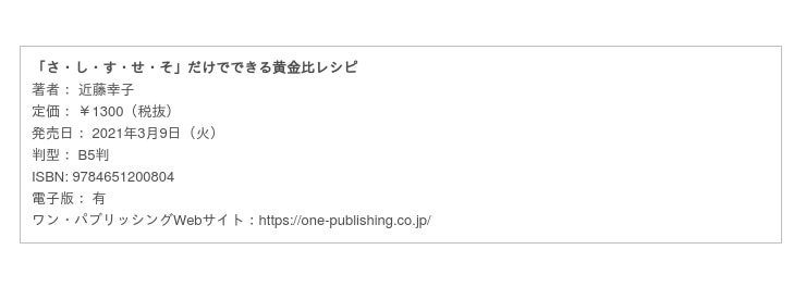 株式会社 ワン・パブリッシング(東京都台東区/代表取締役社長:廣瀬有二)は、『「さ・し・す・せ・そ」だけでできる黄金比レシピ』を発売いたしました。特別な調味料なしに、身近な5つの調味料だけでできるレシピを紹介します。おいしい料理が作れる調味料の「黄金比率」を11パターン掲載。覚えやすい比率で、計量の手間がなくなり、調理がぐっと簡単になります。