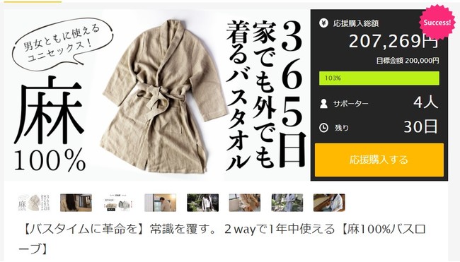 創業76年のタオル会社・株式会社成願が、7月12日(火)よりアタラシイものや体験の応援購入サービス「Makuake(マクアケ)」にて開始いたしました【バスタイムに革命を】常識を覆す。2wayで1年中使える【麻100%バスローブ】プロジェクト。