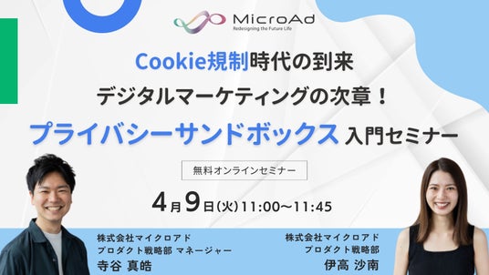株式会社マイクロアド(本社:東京都渋谷区、代表取締役 執行役員社長:渡辺健太郎、以下 マイクロアド)は、デジタルマーケティング担当者向けに、プライバシーサンドボックス入門セミナーを開催いたします。Cookie規制による広告業界への影響と、プライバシーサンドボックスの概要や活用方法などを解説いたします。