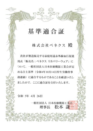 また、併せて同年10月14日付の厚生労働省の事務連絡により、日本医療機器工業会が策定した「家庭用遠赤外線血行促進用衣自主基準」が広く周知されることとなりました。これを受け当社は、「ベネクス リカバリーウェア」の赤外線放射特性に係る試験成績書、血行改善に係る性能評価試験等の結果が、自主基準に適合しているものであると確認され、同工業会より『基準適合証』の交付を受けました。