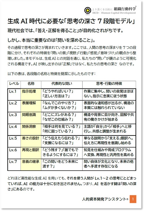 組織行動科学(R) 人的資本開発アシスタント(R)を約980社へ提供するリクエスト株式会社(本社:東京都新宿区、代表取締役 甲畑智康)は、生成AI時代に最も必要な「思考の深さ7段階モデル」を発表しました。
