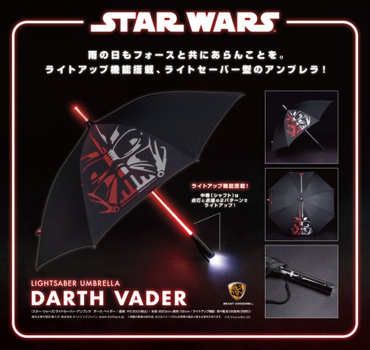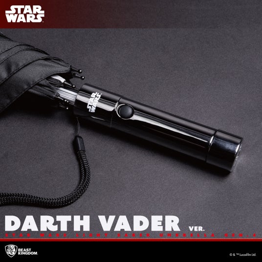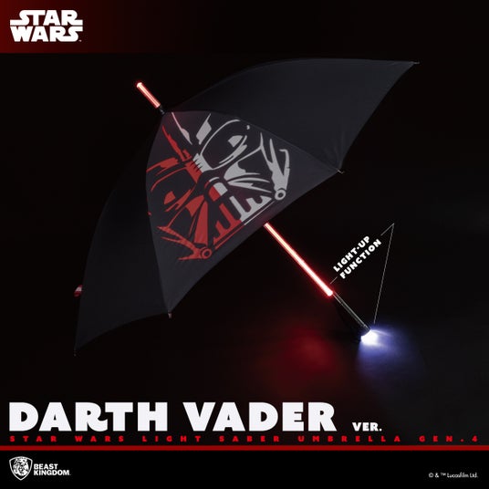 ダース・ベイダーのライトセーバーをモチーフにした傘が登場!全長は約83cm、親骨部分の長さは約58cm。中棒(シャフト)には、赤く光るライトアップ機能を搭載しており、通常の点灯と点滅の2パターンでライトアップできます。