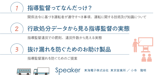 飲酒運転防止のためのアルコール検知器及びIT点呼システムを開発・販売する東海電子株式会社(本社:静岡県富士市 代表取締役:杉本 哲也)は、 この度、 「指導監督の抜け漏れ防ぎませんか(入門編)」セミナー(無料)を10月26日(水)に開催いたします。