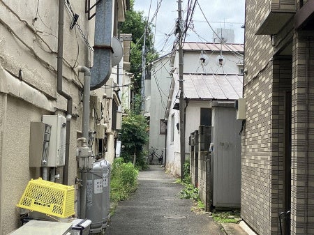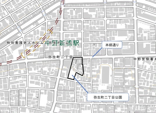 本地区は、東京メトロ丸ノ内線中野新橋駅の南約200mに位置し、本郷通り沿いに面した宅地及び弥生町三丁目周辺地区計画の地区施設に位置付けられた弥生町二丁目公園で構成されており、東京都の「重点整備地域」及び「東京都不燃化推進特定整備地区(不燃化特区)」に指定されています。本地区内には、木造の老朽建築物が密集しており、幅員が狭く行き止まりの二項道路や通路も存在し、さらに、未接道敷地も多く、単独で建替えすることが困難なことから、建物の更新が進まず、防災上大きな問題となっていました。宅地と公園の間には老朽化した擁壁があり、安全性に不安があるものとなっています。