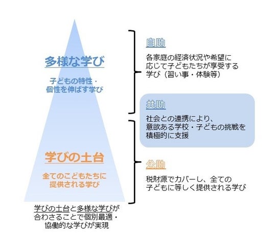 このような中で、子どもたちの個性や特性・状況に合わせた“伸ばす学び”の充実にあたっては、税財源で公平に措置する“そろえる学び”(=「公助」)や、受益者負担による各個人に応じた学び(=「自助」)だけではない、企業や地域社会等との連携や民間資金を活用した「共助」の充実を図ることが重要です。
