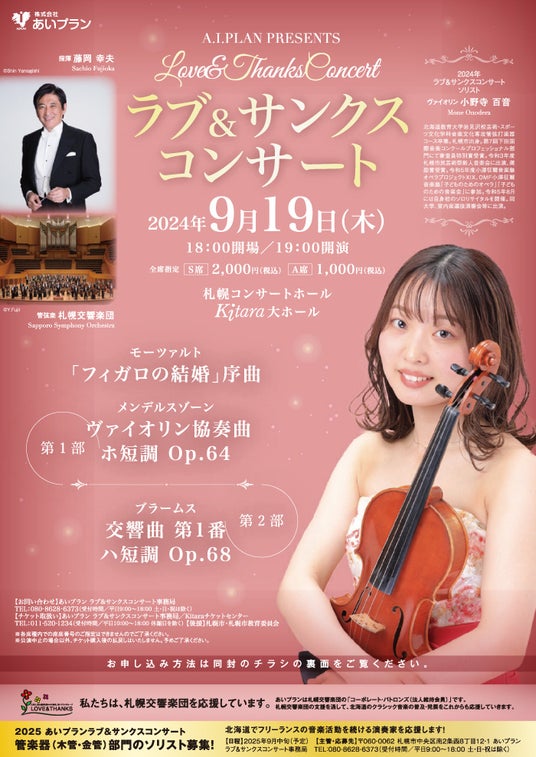 株式会社あいプラン(北海道札幌市)が例年主催している、『ラブ&サンクスコンサート』を今年も札幌コンサートホール Kitara で行います。本年のソリストは小野寺 百音氏(ヴァイオリン)。札幌交響楽団とメンデルスゾーンのヴァイオリン協奏曲ホ短調で共演します。