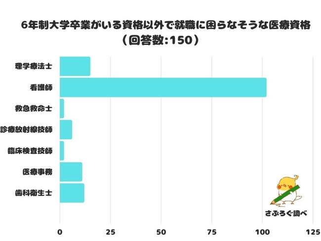 6年制大学卒業がいる資格以外で就職に困らなそうな医療資格をアンケートにて調査したところ、1位は「看護師」でした。