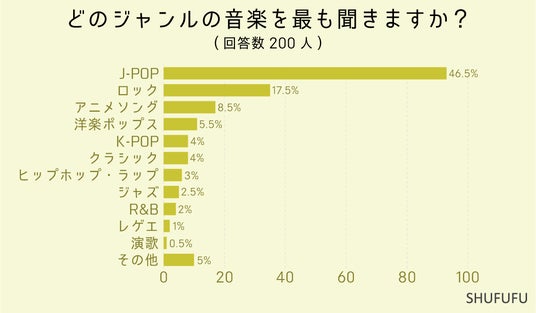 どのジャンルの音楽を最も聞きますか?の問いに対して最も多かったのが「J-POP(46.5%)」でした。 次いで「ロック(17.5%)」「アニメソング(8.5%)」という結果でした。音楽の人気ランキングでもJ-POPが上位を占めていることが多いですし、実際に人気が高いようです。