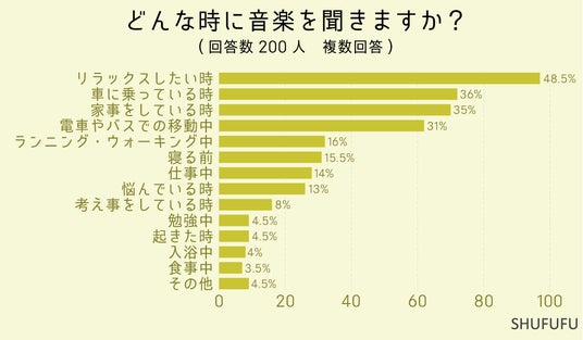 どんな時に音楽を聞くかに関しては1位「リラックスしたい時(48.5%)」、2位「車に乗っている時(36%)」でした。忙しい毎日の中でも音楽を聴いているときはとてもリラックスできますよね。