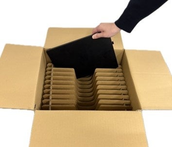 モバイルPC・タブレット端末を最大10台まで1つの容器にまとめて収納できます。1台ずつの個別梱包が不要となるため、梱包作業の省力化と効率的な輸送を実現します。