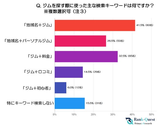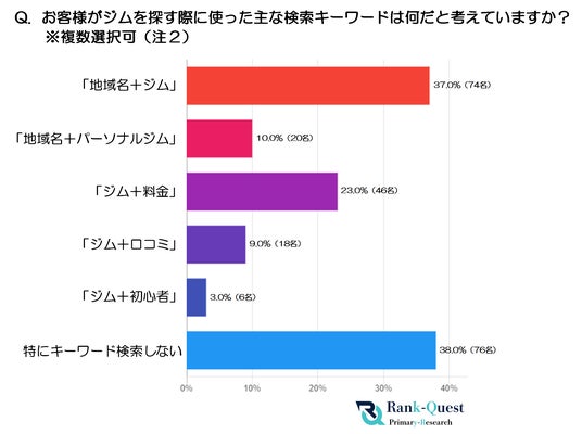 そこで、Google検索【SEO対策】で1位獲得の実績(注1)を持つランクエスト(https://rank-quest.jp/column/column/how-to-seo/ )は、独立開業しているフィットネスジム経営者200名と、実際のジム加入者200名を対象に『Web上での検索キーワード』に関するアンケート調査を実施しました。