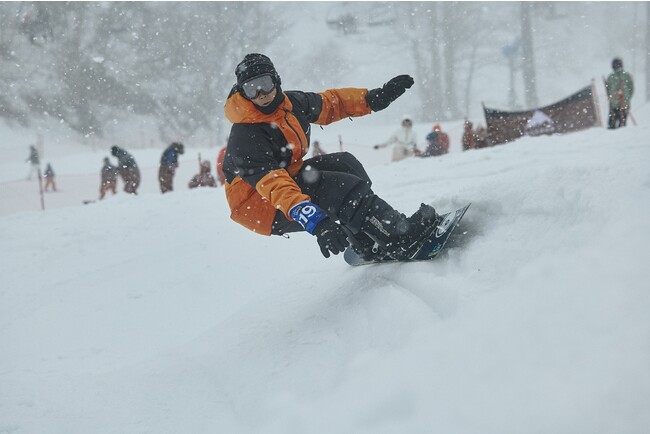 雪上で行われた開会式に次いで、MCが盛り上げる中特設コースがオープン。青いゼッケンをつけた参加者が少し柔らかくなった春雪の感触を確かめながら、自身のレベルに合わせて思い思いにバンクドスラロームのコースを攻めていました。1本目を滑り終わった後、お互いのライディングやコースの特徴、2本目はどうやってタイムを伸ばそうか?といった会話に、大人も子供も関係なく夢中になるといった、同じコース条件を参加者全員が共有するバンクドスラロームならではの光景が見られました。当日たまたま会場に居合わせた人たちも、コースサイドからイベント様子を眺めながら雰囲気を楽しんでいました。また、誰でもトライできるパークでは、プロからビギナーまで自由にスタイルを披露し、会場にいる観客を大いに湧かせていました。さらに、参加者にはランチも無料で提供され、ライディングだけでなく、仲間と共に楽しい時間を過ごす醍醐味も、存分に味わったイベントとなりました。
