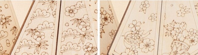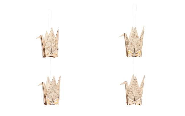「折り鶴」は、日本の伝統的な和が感じられるモチーフが特徴的な3Dウッドパズル。「折り鶴壱」と「折り鶴弐」には、それぞれ異なるデザインが描かれており、1つの箱の中に柄違いの鶴が2種類セットで入っています。