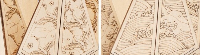 縁起の良いモチーフとして親しまれる鶴。ウッドパズルの焼きで表現した繊細な模様が魅力