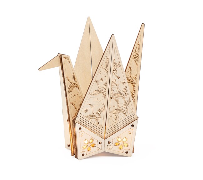 また、LEDライト付きなので、鶴の下の部分が光ります。下のウッドパズルの隙間部分には、半透明紙を使用しており、ライトを付けるとほんのりと光が漏れ、違った雰囲気を楽しめます。