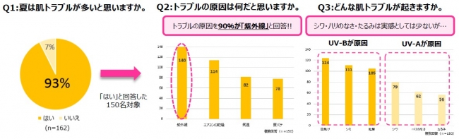 その結果、夏に肌トラブルが多いと回答した150名のうち、トラブルの原因は紫外線であると回答したのは90%、実際に起きている肌トラブルとして「日焼け」・「シミ」という回答が多く挙げられました。【データ1.参照】