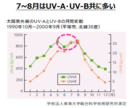 日焼けの原因となってしまうのが、この時季年間で最も多く、すぐに肌の表面へ作用するUV-Bという中波長の紫外線です。しかし、多くの人が感じる日焼けやシミ以外にも、紫外線の種類によって様々な肌トラブルが引き起こされています!それはUV-Aという5月に続いて7・8月にも多い長波長の紫外線で、UV-Bとは異なりすぐに肌の表面上のトラブルへ繋がるのではなく、じわじわと時間をかけて肌の奥にもダメージを与えます。その結果、真皮内にあるコラーゲンやヒアルロン酸がダメージを受けてシワやたるみ等の“肌老化”を招いてしまいます。【データ2.参照】