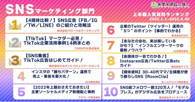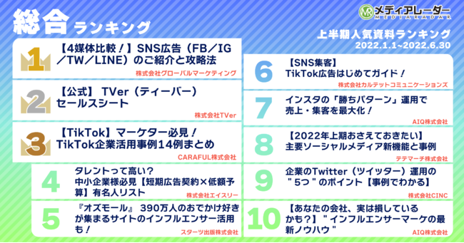 5位以降には、1位同様のSNS比較資料が2資料ランクインを果たしています。「TikTok」の台頭や既存SNSの新機能追加など、移り変わりの早いSNSマーケティング業界。1資料で各ソーシャルメディアの特徴を網羅できる「SNS比較資料」が支持を集めた上半期となりました。