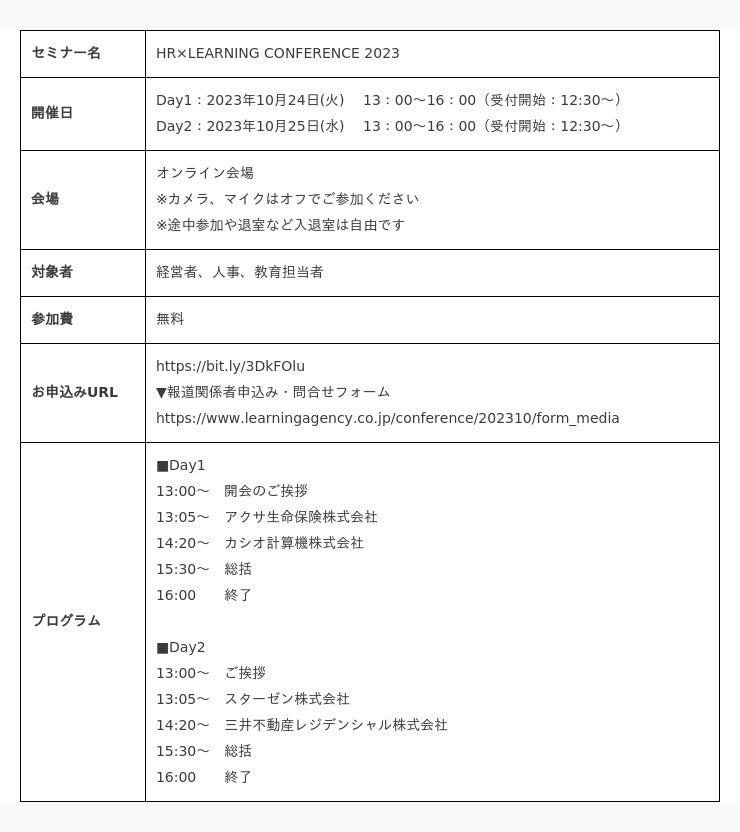 累計13,000社370万人以上の組織開発・人材開発を支援する株式会社ラーニングエージェンシー(本社 東京都千代田区、代表取締役社長 眞崎大輔)は、日本の各業界を代表する4社の人事・教育責任者をお招きし、人材育成の推進・変革のヒントをお届けするオンラインイベントを、2023年10月24日(火)~10月25日(水)に開催します。