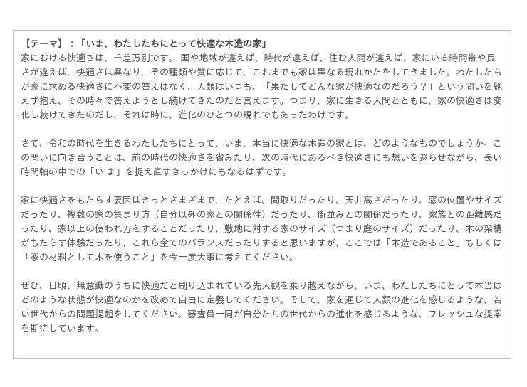 内容:「いま、わたしたちにとって快適な木造の家」のテーマに沿った作品