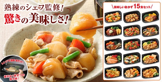 味わい惣菜は、お惣菜のサブスクリプションサービスです。一回15食分、和洋中様々な料理を毎月お届けします。調理歴50年以上の熟練シェフが監修した本格的な味わいを、電子レンジで温めるだけでお楽しみいだだけます。