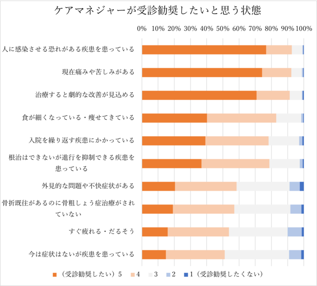 このことからも、ケアマネジャーの受診勧奨をより活発にするためには、疾患に関する知識の啓発が欠かせないことが分かります。