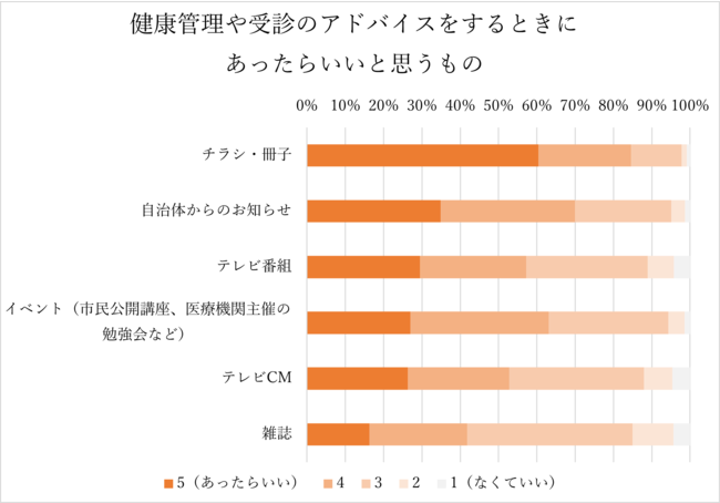 健康管理や受診のアドバイスをする際にあったらいいと思うものとして、最も高い評価を得たのは「チラシ・冊子」でした。これは、利用者やその家族との会話のきっかけとして使いやすいツールなのかもしれません。