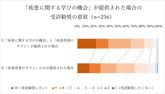 さらに、「疾患啓発のチラシ」に加えて「学びの機会」が同時に提供されることにより、受診勧奨の意欲は高くなることが分かりました。