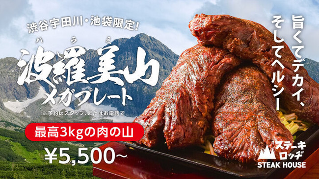 株式会社ファイブグループ(東京都武蔵野市:代表取締役社長 坂本憲史)の関連会社である株式会社B級グルメ研究所(東京都武蔵野市:代表取締役社長 坂本憲史)が運営するステーキハウス『ステーキロッヂ』は、渋谷宇田川店・池袋店限定で、ハラミのメガ盛りメニュー「波羅美(ハラミ)山メガプレート」を4月12日(火)から発売いたします。