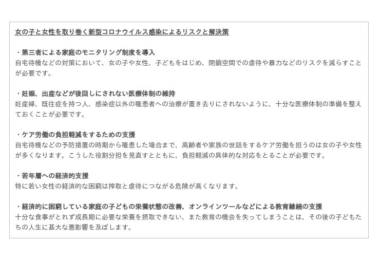 新型コロナウイルス(COVID-19)の感染拡大で社会的・経済的な打撃を受けるのは弱い立場に置かれやすい人です。「弱い立場に置かれた人々」というのは今の日本社会にも大勢存在することを忘れてはいけません。特に思春期の女の子や若い女性が直面しているリスクは、コロナウイルスの感染拡大に比例して増大しています。感染症流行が引き起こす分断と対立、弱者切り捨ての風潮が加速化しています。今こそ国境やジェンダーといった分断をせず、真の意味での「誰一人取り残さない」理念に基づいた連帯と協調、そして幅広い視野に立って多様なニーズをきめ細かくすくい上げ、支えることが求められています。