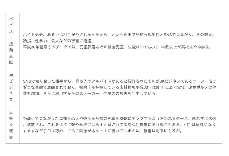 平成30年警察庁のデータによると、SNSが原因で性に関する被害にあった18歳未満の子どもの数は1811人(高校生991人、中学生624人)で、これは過去最高だった昨年度から横ばいの数値です。多くがTwitter、LINEなどを使用しており、なかでも女の子を巻き込んだ以下のようなケースが挙げられます。