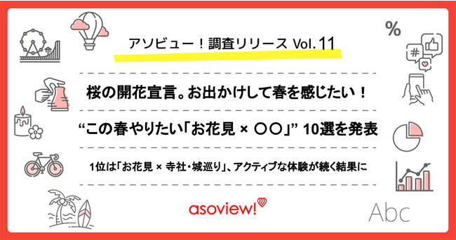 「生きるに、遊びを。」をミッションとし、「遊び」が衣食住に並ぶ人生を彩る豊かなものとして、Well-Beingな社会の実現を目指すアソビュー株式会社(所在地:東京都渋谷区、代表取締役CEO:山野 智久、以下、当社)は、桜の開花宣言もされた今年の春、春を感じながらやりたい「お花見 × 〇〇」をテーマに全国調査(n=4,002)を行い、ランキングを策定しました。
