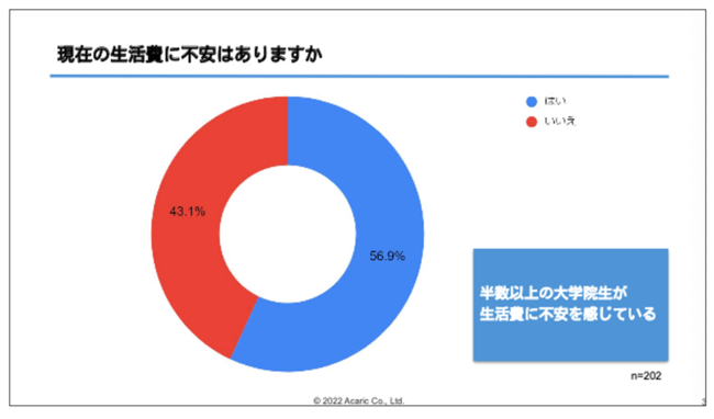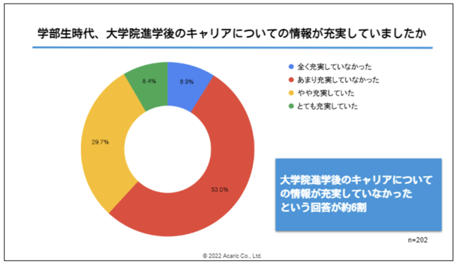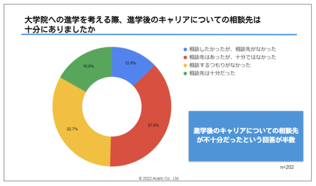 アカリクは、15年間に渡る大学院生向け就職活動支援を通して、学生の専門性を活かす企業とのマッチングを実施してまいりました。支援する中で、大学院に進学するか悩む学部生も多く見受けられ、その背景には大学院修了後の企業側の受け入れに対する懸念や、経済的な理由も多く挙げられていました。アカリクの調査(※)によると、61.9%の学生が、自身の大学院進学後のキャリアについて「学部生時代に情報が充実していなかった」と回答していることに加え、進学後のキャリアについての相談先も「相談したかったが、相談先がなかった」(12.9%)や、「相談先はあったが、十分ではなかった」(37.6%)といった声が多く挙がりました。学部生のうちに自身のキャリアについてしっかりと相談できたり、大学院進学後のキャリアについて潤沢な情報があることで、より自信を持ってキャリアに関する意思決定ができるといえます。加えて、約6割の学生が生活費に「不安」を感じていると回答しており、昨今の物価高騰の影響で生活費が圧迫され、より一層就活にお金がかけられなくなっている学生の実態も明らかになりました。