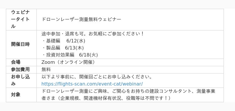 株式会社FLIGHTSは6月12、13、18日の3日間、Zoomにて測量、建設コンサルタント事業者様を対象に、これまでにのべ1,800名以上が参加した人気のウェビナーを開催します。