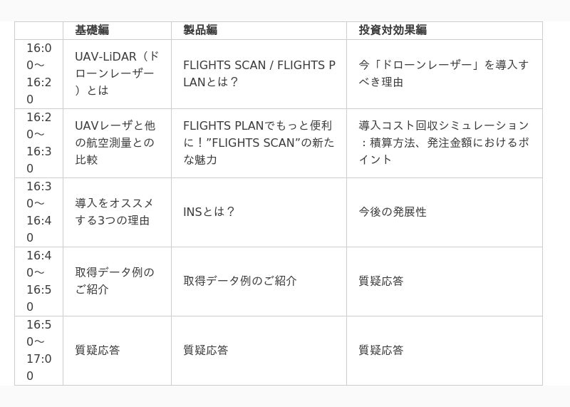 今回のウェビナーは、建設コンサルタント、測量関連の事業者さまにむけて開催されます。企業・団体の規模、ドローンやその他のレーザー機器の保有状況は問いません。業種や役職も不問。少しでもドローンレーザー測量に関心があり、ご都合の合う方は奮ってご参加ください。