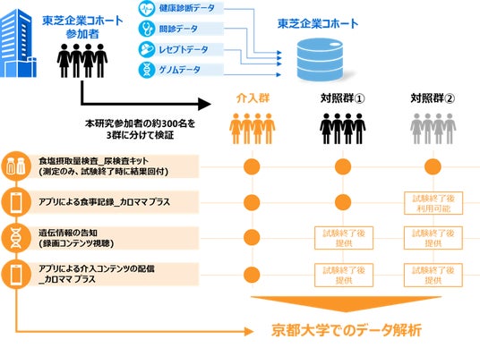 東芝は、同意が得られた従業員からゲノムデータおよび過去10年以上のヘルスデータ(健康診断、問診結果、レセプトデータ)を収集・蓄積した1.5万人を超える企業コホートを保有しています。今般3者は、企業コホート登録者のうち、本研究に同意した従業員(約300名を予定)を対象に調査を実施します。条件を変えて比較し、効果を検証するため、参加者を、介入群、対象群1.、対象群2.の3つに分けます。介入群に対しては食塩感受性遺伝子型を有することを告知した上で、Wellmiraが提供するAI健康アプリ「カロママ プラス」に食事内容を記録してもらい、AIによるアドバイスや、減塩や食塩感受性遺伝子型に関するコラムやクイズを配信します。対象群1.・2.に対しては遺伝情報の告知は行わず、対象群1.は食事内容をアプリに記録しますが、アドバイスやコラムなどの配信はなく、対象群2.はアプリを使用しません。3ヵ月間の調査で得られたデータや参加者の健康診断結果などの情報について、京都大学が研究機関としての医学的知見を生かし、解析・分析を行います。