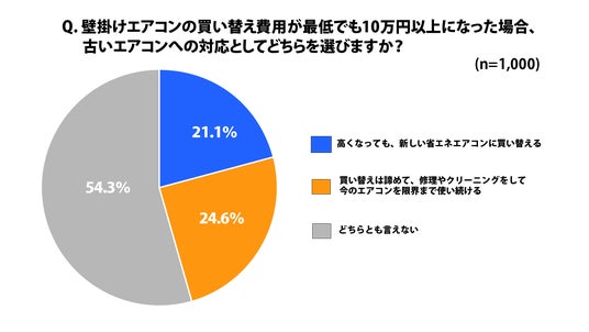 2027年以降、エアコンの買い替え費用が10万円以上になった場合、買い替えではなく、メンテナンスとして修理やクリーニングでの対応をしたい方は約4人に1人となり、「どちらとも言えない」検討中の方が半数となりました。