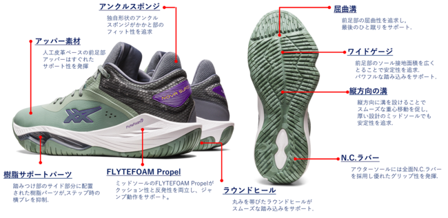 ミッドソールは現行(2023年1月12日時点)の当社バスケットボールシューズの中でも最も厚い設計で 、優れたクッション性を発揮し、激しいプレー中の足への負担を軽減します。