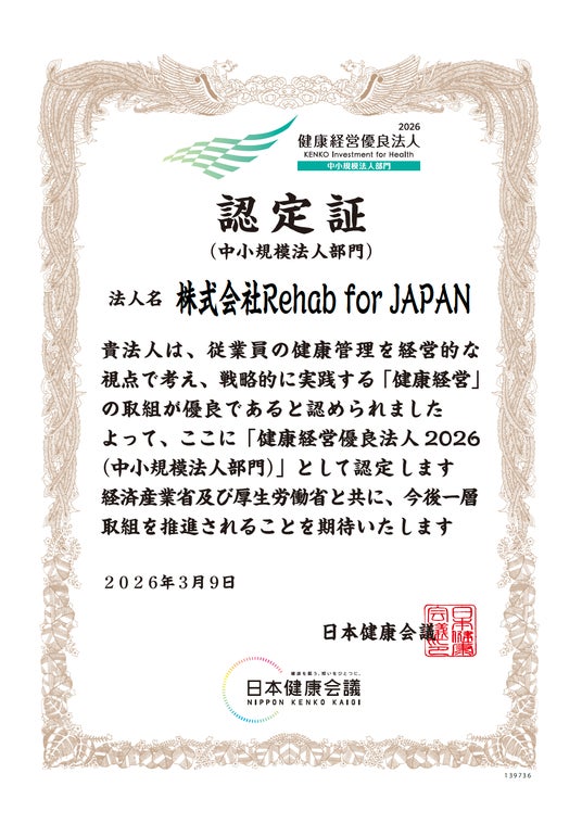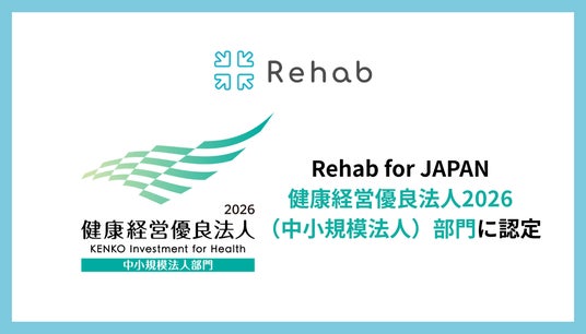 科学的介護ソフト「Rehab Cloud(リハブクラウド)」を運営する株式会社Rehab for JAPAN(本社:東京都千代田区、代表取締役社長 CEO:大久保 亮、以下「当社」)は、この度、経済産業省および日本健康会議が実施する「健康経営優良法人2026(中小規模法人部門)」に認定されたことをお知らせいたします。
