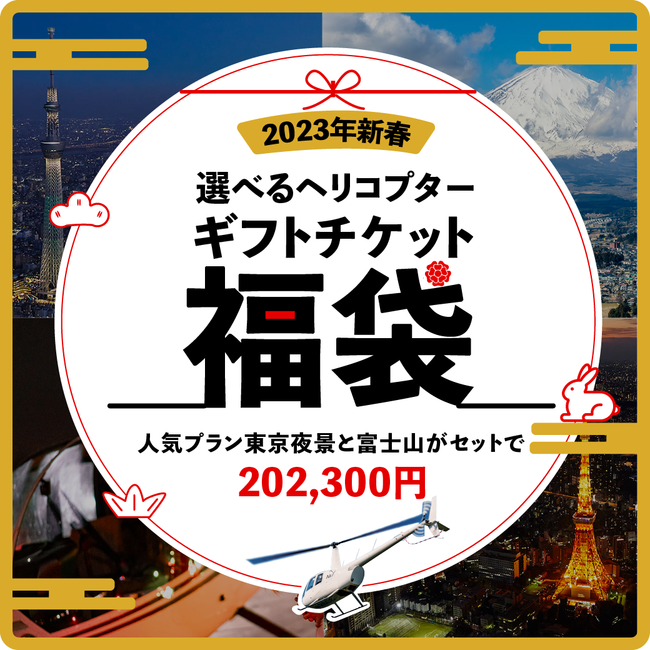 この度2023年新春特別企画として、人気のチケットをセットにした「選べるヘリコプターギフトチケット福袋」を、202,300円で販売いたします!人気の富士山フライトと都内ナイトフライト、都内デイフライトが、特別セット価格でお楽しみいただけます。