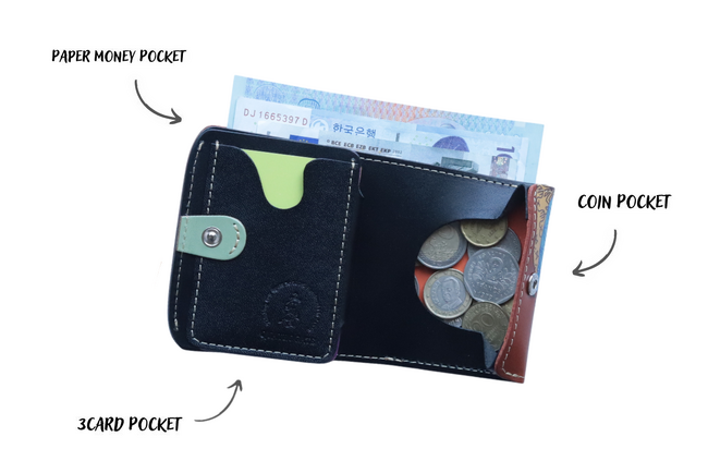 お財布の女性が頭に身につけているのはアフリカ民族衣装である色鮮やかなカンガであり、そのデザインはピグミーと呼ばれるコンゴの森に住む狩猟民族の伝統アートをモチーフにしています。