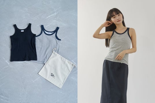 初のコラボレーションアイテムは、Robert P. Millerで定番のアメリカンスリーブデザインを小柄女性のためのオリジナルサイズにアレンジしたタンクトップの無地とボーダー2種、オリジナル巾着がセットになった特別なアイテムです。