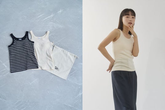 タンクトップは、1枚で着用いただけるようカップが付いており、ヘルシーかつ女性らしい雰囲気と身体に優しくフィットする着心地の良さが魅力です。着心地抜群のやわらかなコットン素材で作られたパネルリブ生地を使用しており、伸縮性や速乾性にも優れ、洗うたびに風合いが増していきます。