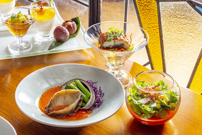 ふっくらと蒸した鰻をオイスターソースベースで仕上げる「鰻のクミン山椒ソース炒め」、紹興酒、葱、生姜の香りを移しながら柔らかく蒸しあげた鮑に濃厚な雲丹ソースを合えた「鮑の柔らか蒸し 雲丹ソース」、お口直しにもぴったりの「彩り野菜サラダ アセロラ梅ドレッシング」をゆったりとご賞味いただけます。