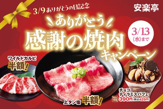 焼肉レストラン安楽亭(本社:埼玉県さいたま市、代表取締役:柳 先)は、2024年3月8日(金)から3月13日(水)まで、「上タン塩」がなんと【半額】のほか、新作パフェがサンキュー価格の390円(税込429円)など、感謝の気持ちを込めた特別価格で上質な美味しさをご提供する「ありがとう感謝の焼肉キャンペーン」を開催します。