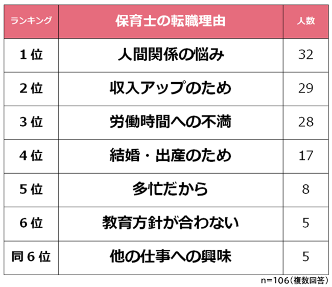 転職経験のある保育士106人にアンケート調査を実施したところ、「保育士の転職理由」第1位は「人間関係の悩み」でした。