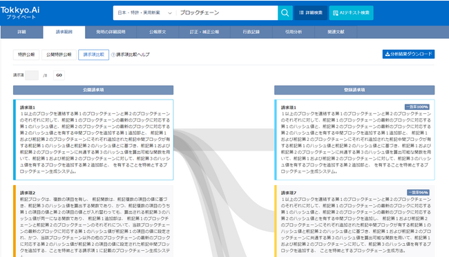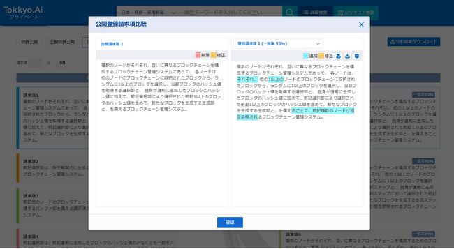 請求項比較機能では、特許庁による審査の結果、公開公報と登録公報の請求項がどのように修正されたかを直接確認できます。この機能は、特許の審査過程の理解を深めるために非常に有用です。