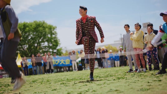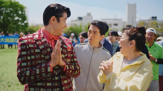 快晴の空の下、馴染みのある華やかな衣装で撮影入りした鈴木亮平さん。カメラに手を振り、明るい表情で「よろしくお願いします」とスタッフに挨拶。撮影監督との打ち合わせではさっそく億山を演じて見せる場面がありました。今回は大勢のエキストラが参加している中で撮影がスタート。億山独特のリズミカルなセリフと大縄跳びに挑戦しようとタイミングを計るも入れないコミカルな動きに挑む鈴木亮平さん。カットの声がかかると、億山の姿に共演者・スタッフが思わず笑ってしまうシーンも。一方で、自分の演技を真剣に確認する場面や監督と細かい動きを確認する姿も垣間見え、良い緊張感がありながらも和やかな雰囲気の撮影現場となりました。地域の大縄大会で次の12億当せん者は自分かもしれないというワクワクを楽しそうに表現する億山に注目です。